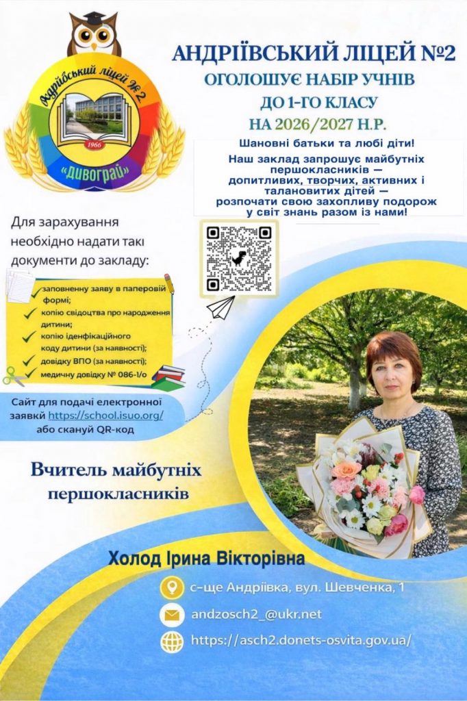 Для отримання роз’яснень звертайтесь за телефоном 0665553572 – директор Андріївського ліцею №2 Чаговець Світлана Вікторівна, також пишіть на адресу ліцею andrzosh2_@ukr.net