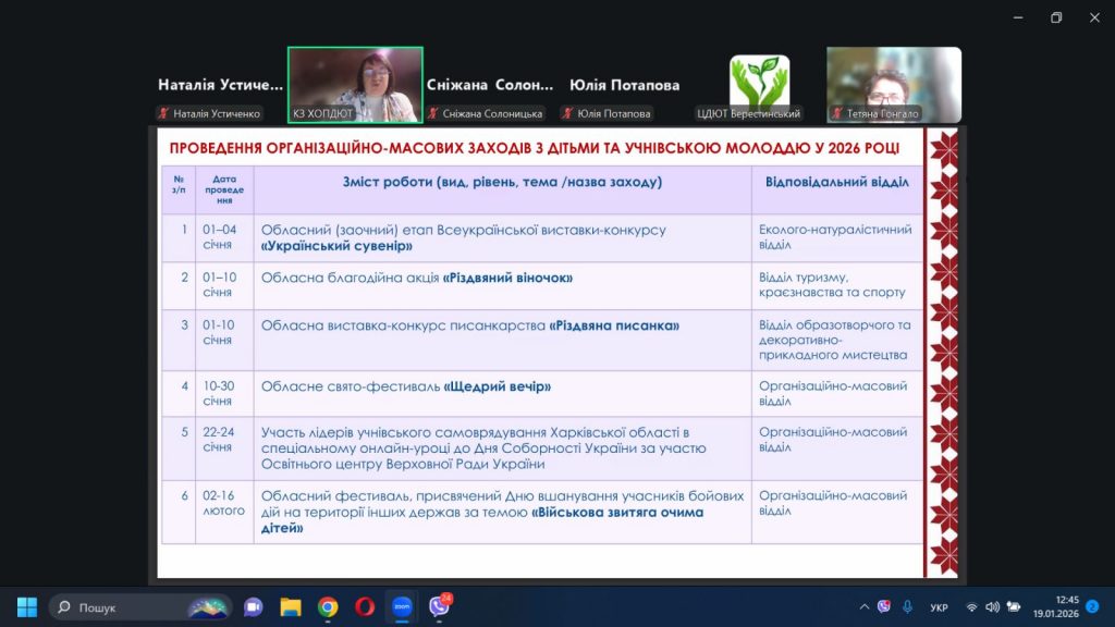19 січня 2026 року відбулася координаційна нарада ХОПДЮТ, присвячена організації та проведенню обласних масових заходів у 2026 році. З вітальним словом до учасників наради звернулася директор Палацу Тетяна Євгенівна Підберезкіна, яка окреслила ключові завдання та наголосила на важливості злагодженої співпраці. У ході наради з доповідями виступили методисти різних відділів, які презентували основні напрями роботи та особливості підготовки заходів.