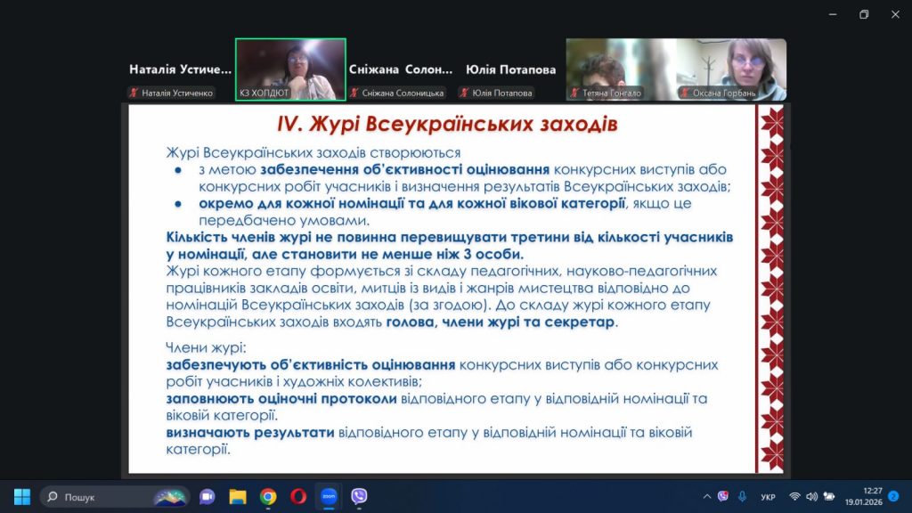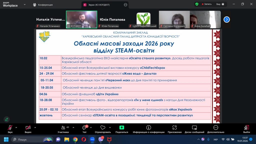 19 січня 2026 року відбулася координаційна нарада ХОПДЮТ, присвячена організації та проведенню обласних масових заходів у 2026 році. З вітальним словом до учасників наради звернулася директор Палацу Тетяна Євгенівна Підберезкіна, яка окреслила ключові завдання та наголосила на важливості злагодженої співпраці. У ході наради з доповідями виступили методисти різних відділів, які презентували основні напрями роботи та особливості підготовки заходів.